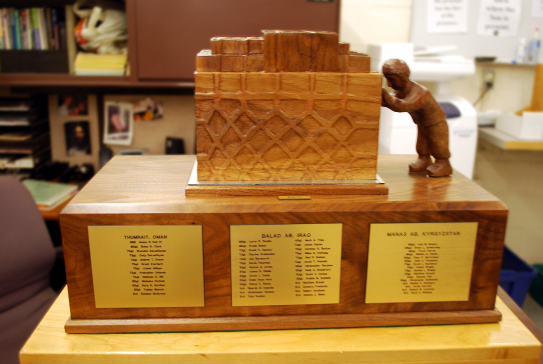This walnut trophy was presented to the 67th Aerial Port Squadron by Richard Neeley in honor of those members of the squadron who deployed in 2011. The trophy is all walnut with a natural finish and took over 100 hours of dedicated labor. Richards helpers included Bruce Koster, Paul Giles, and Wendell Cloward.